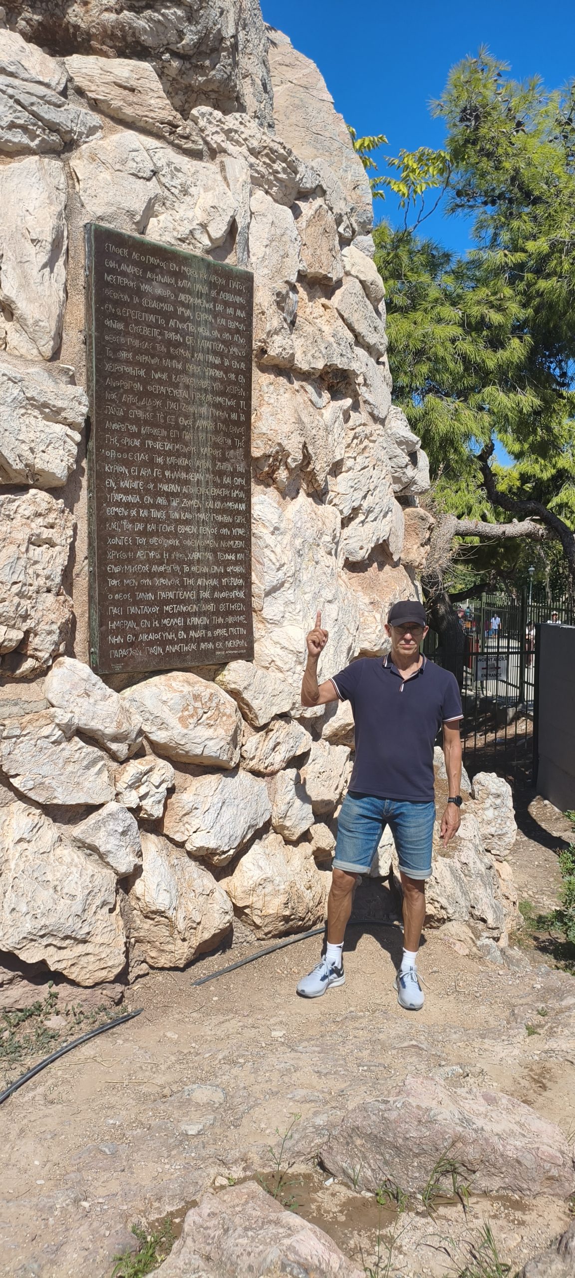Bajando de vuelta por el mismo camino, me desvié unos pocos cientos de metros, con la ayuda del Google Maps para llegar hasta la pequeña colina del Areópago, lugar donde se reunía un cuerpo de jueces y gobernantes de prestigio que hacía cumplir las leyes en Atenas. En aquel lugar Pablo pronunció un memorable discurso que se encuentra en Hechos de Apóstoles, capítulo 17. Una copia en griego antiguo de ese pasaje se encuentra esculpido en aquel lugar y del cual dejo una foto.