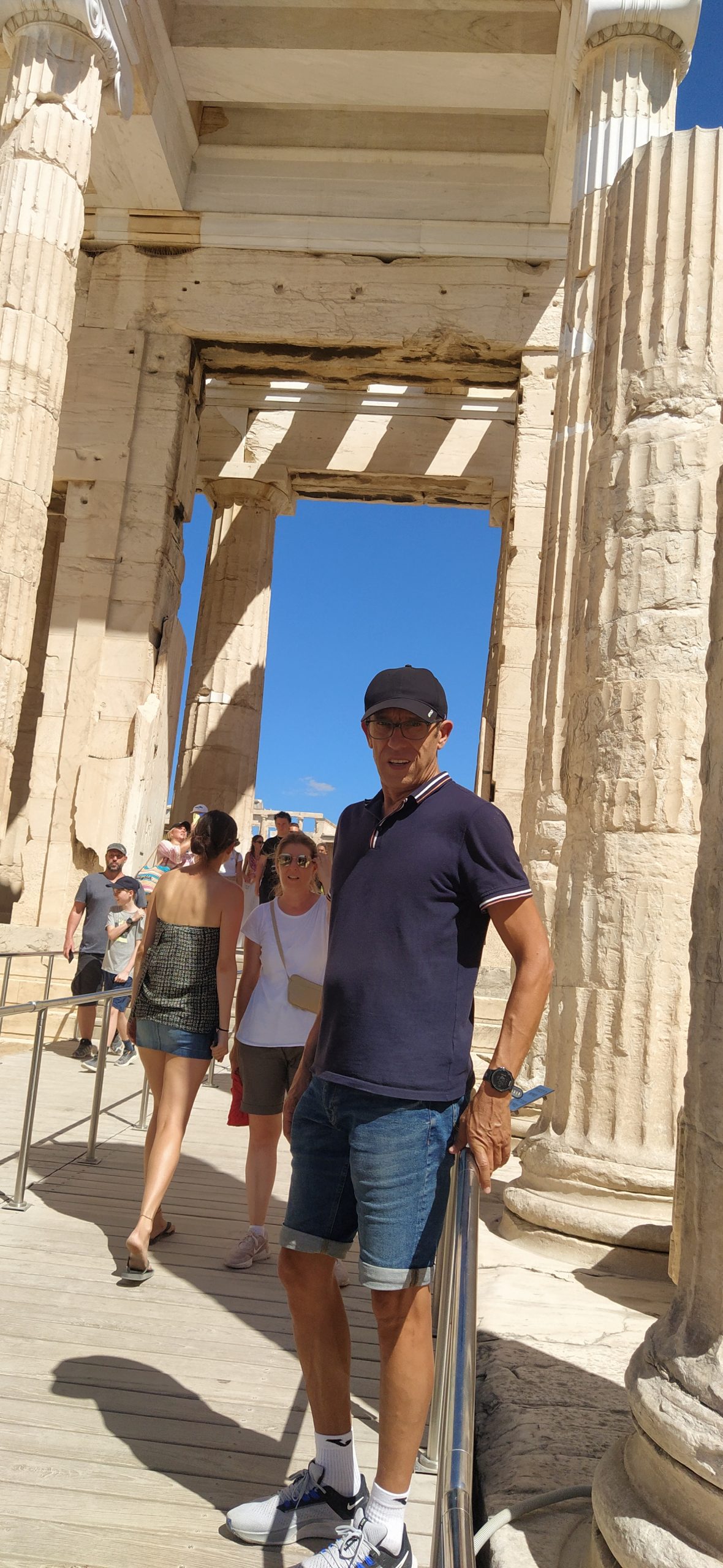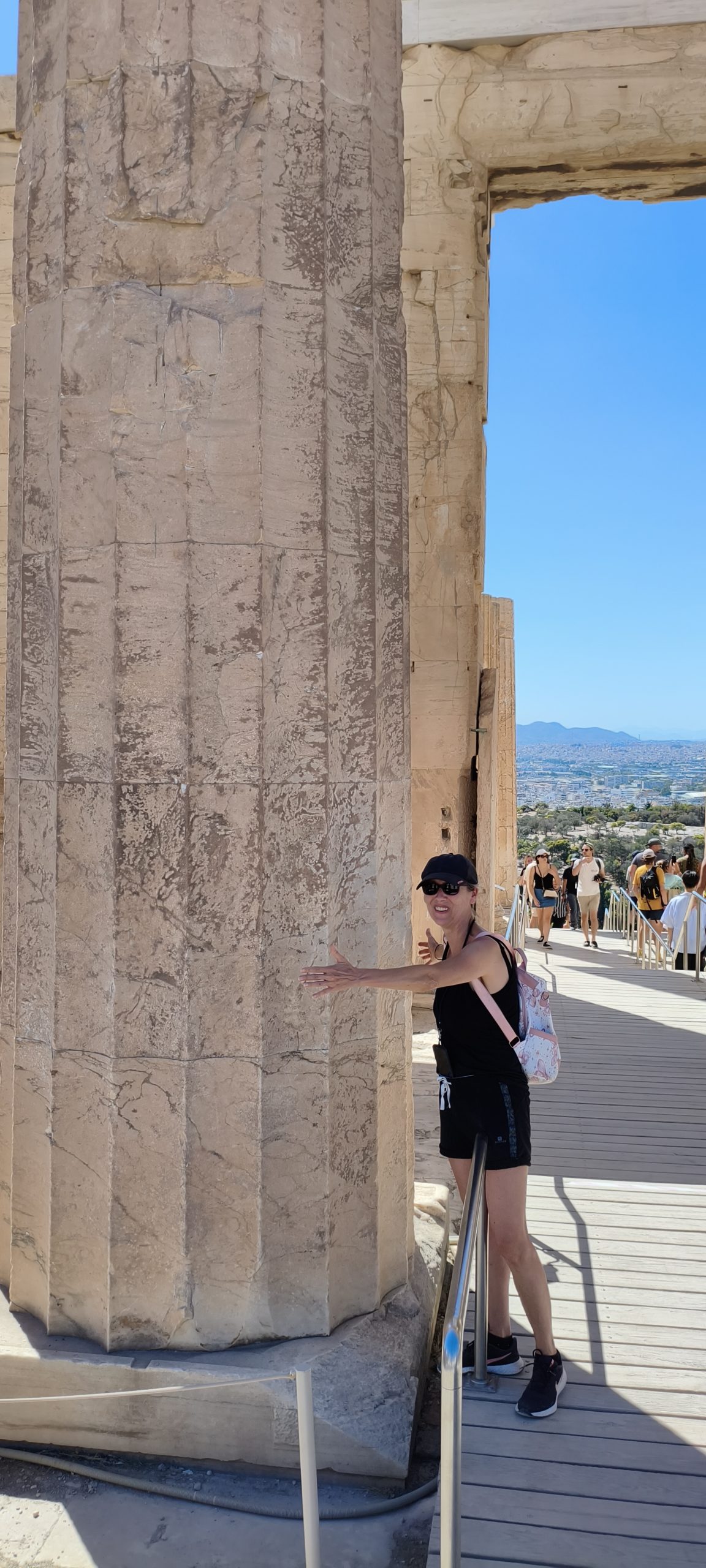 Conforme vas haciendo cumbre te encuentras ese pórtico grandioso de columnas de unos 13 metros de alto, los Propíleos. Al cruzarlas, Mar intentó rodear una de ellas con sus manos, para que le hiciera una foto y se percibieran sus dimensiones, pero sin tocarlas, ya que los carteles lo prohibían, aun así una de las celosas vigilantes le gritó malhumorada y con voz fuerte: “Don’t touch, don’t touch” (no las toques, no las toques). Yo también dije alzando la mía: “She is not touching, she is not touching”. Cuando por fin se percató de que no estaba poniendo sus manos sobre la piedra nos permitió echar la foto.
