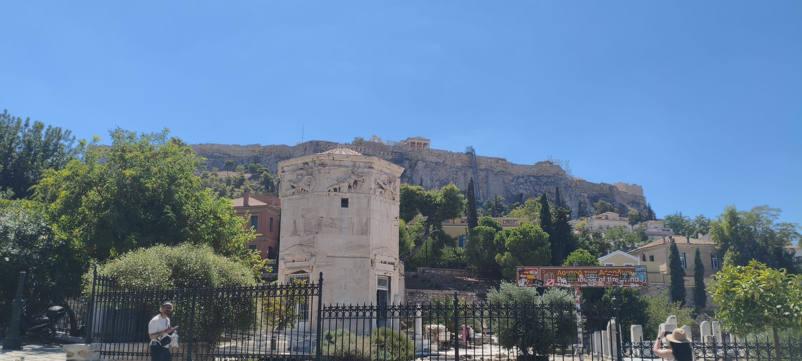 En esa amplia llanura merece la pena detenerse también en la vista circular que se obtiene de toda la ciudad y su puerto. El calor, a pesar de que no existe un solo árbol en aquel sitio, se disipaba un tanto con la brisa continua que recibe por su altitud. Sentarse allí y reflexionar en lo que aquel sitio ha supuesto en la historia de la humanidad, como referente inequívoco de lo que hoy es la cultura de occidente, eriza el vello de tan solo pensarlo.